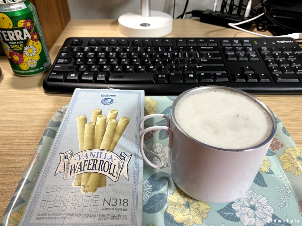 소주 한 병 비우고 입가심으로 노브랜드 바닐라 향 웨이퍼롤을 안주 삼아 맥주 한잔한다. 그렇게 간단한 혼술은 마무리된다.