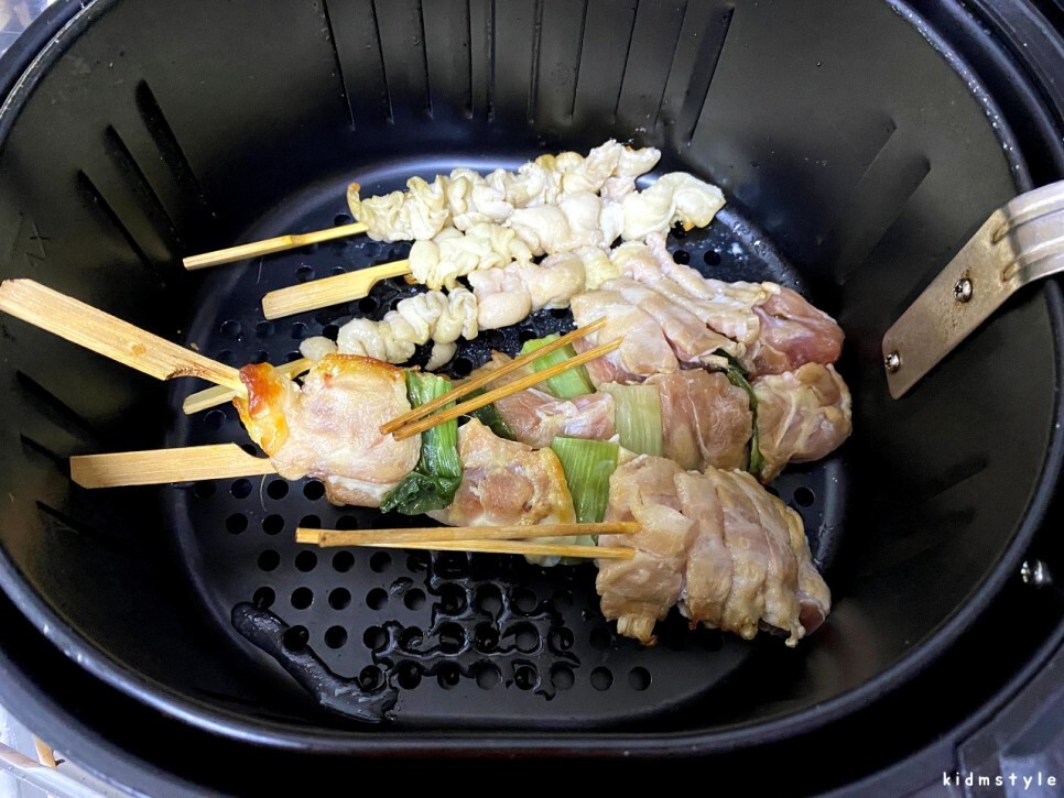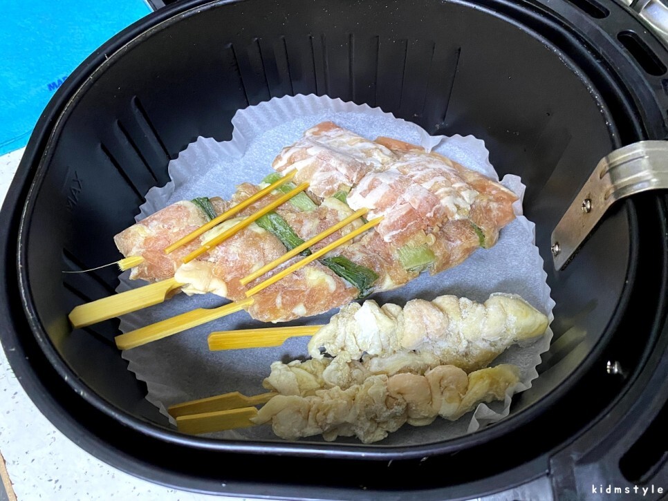 냉동실에서 꽁꽁 얼어있던 꼬치이다. 에어프라이어에 종이 호일을 깔고 꼬치를 올린다.