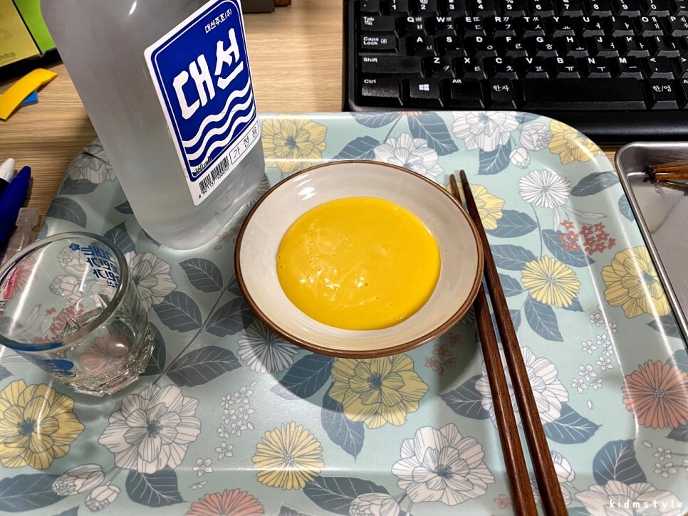 머스타드 소스를 접시에 담고 시원한 부산 소주 대선도 한 병 가지고 왔다. 냉장고에서 막 꺼내서 시원함이 소주병에서 느껴진다.