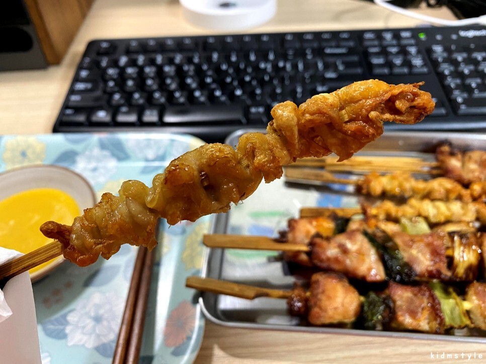 그리고 가장 좋아하는 닭껍질꼬치를 집어본다. 바삭하다.