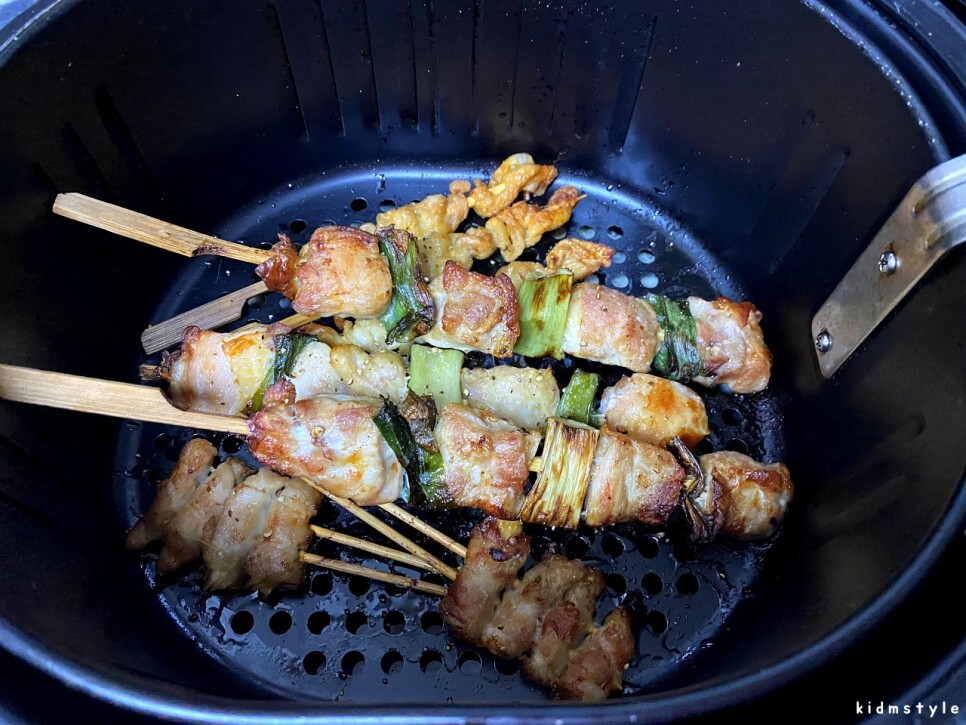 닭꼬치, 삼겹살 팽이버섯말이꼬치, 닭껍질꼬치 등이다. 깔아놨던 종이 호일을 빼서 버렸다. 기름이 밑으로 빠지게 돌리는 게 낫겠다.