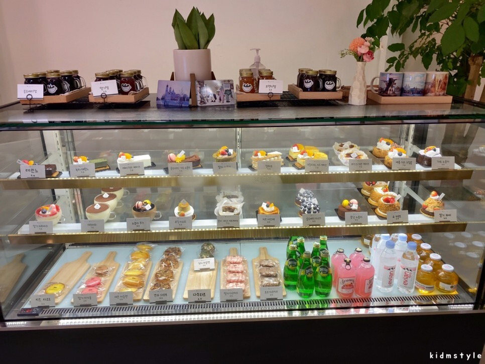 카운터 오른쪽에 있는 케이크 쇼케이스이다. 딸기잼 등 잼도 판매하고 페리에, 에비앙, 마르티넬리 애플 쥬스도 눈에 띈다.