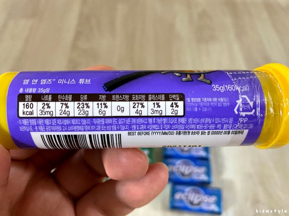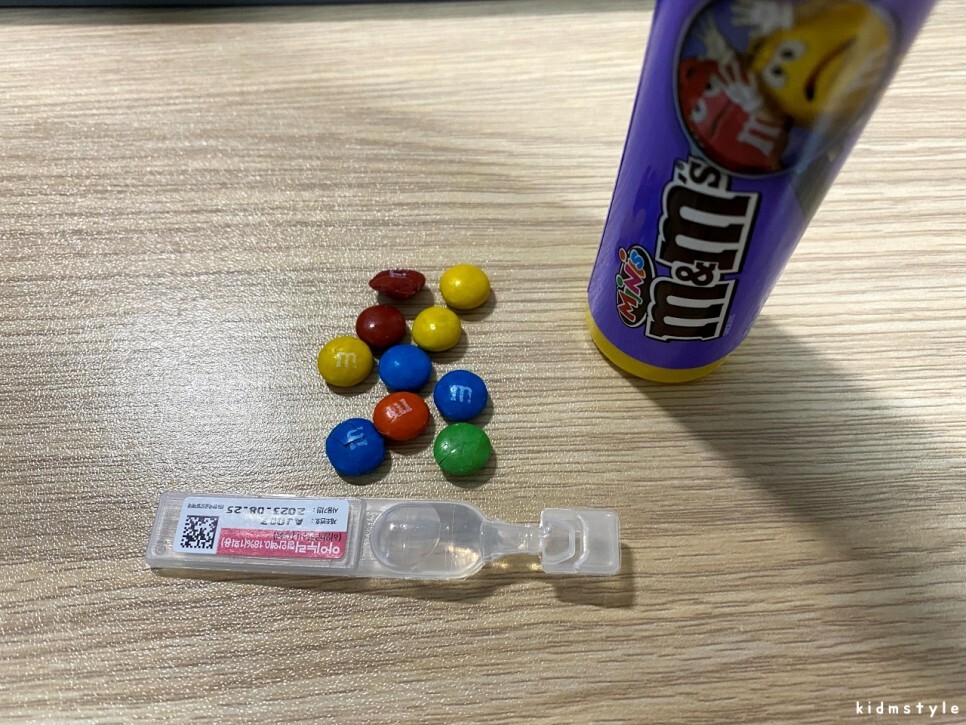 증정품으로 받은 엠앤엠즈 미니스 튜브 m&m's minis tube이다. 알맹이가 참 작다. 일회용 인공눈물과 크기 비교이다.