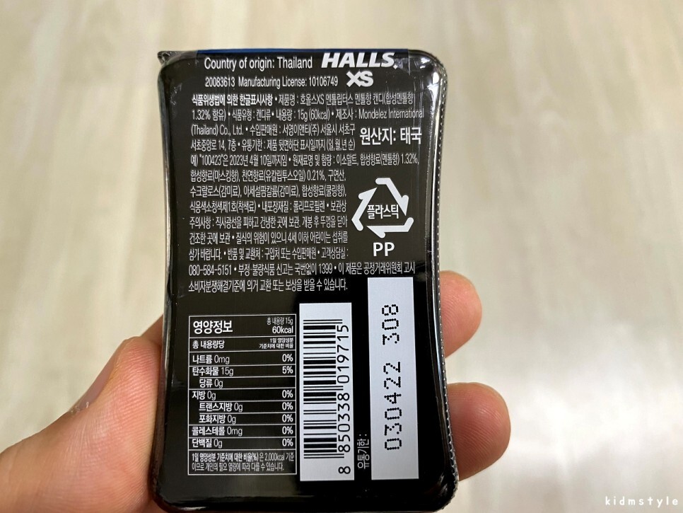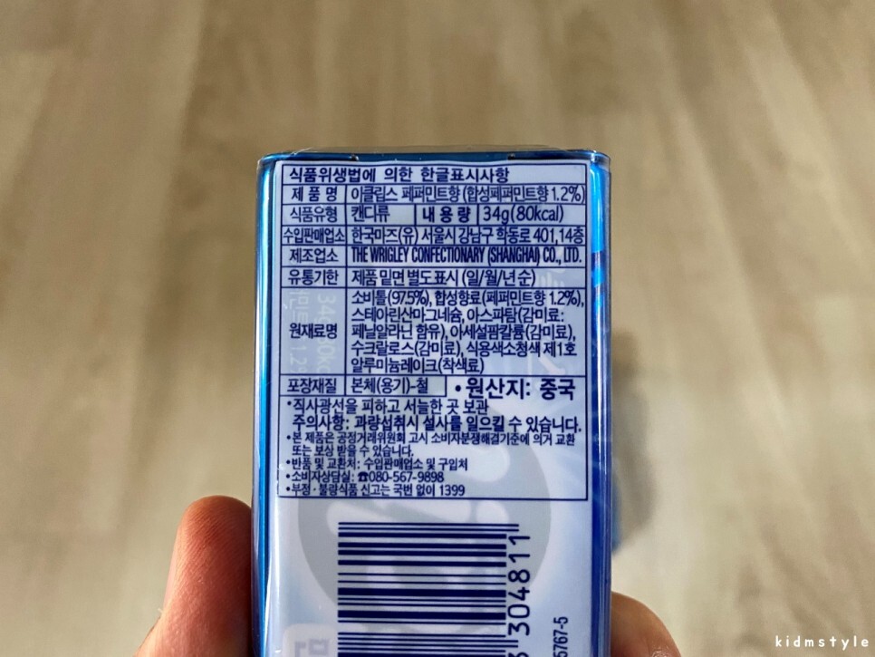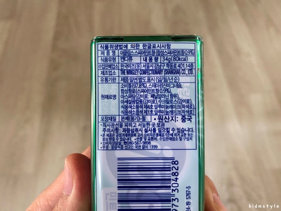 스피어민트향은 34g, 80kcal이다. 호올스 XS보다 2배 정도 많이 들어가 있다. 원산지는 중국이다.