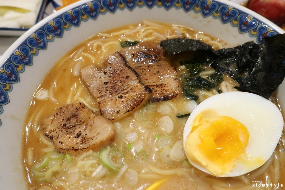고명으로는 김, 삶은 계란, 차슈 3조각이 올라가 있다.