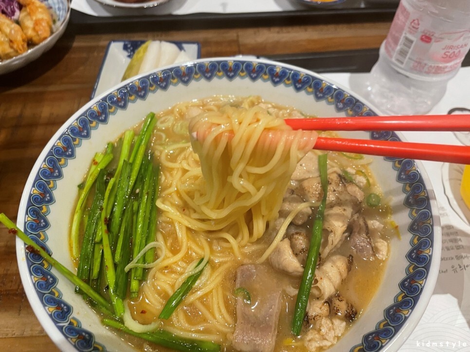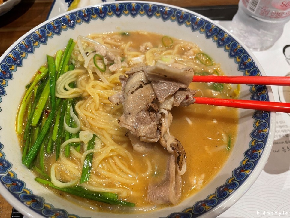 고기 고명이 꽤 올라가 있다. 국물을 맛보니 느끼하지 않고 깔끔한 맛이 난다. 이 집에서 부추라멘이 잘나간다고 한다.
