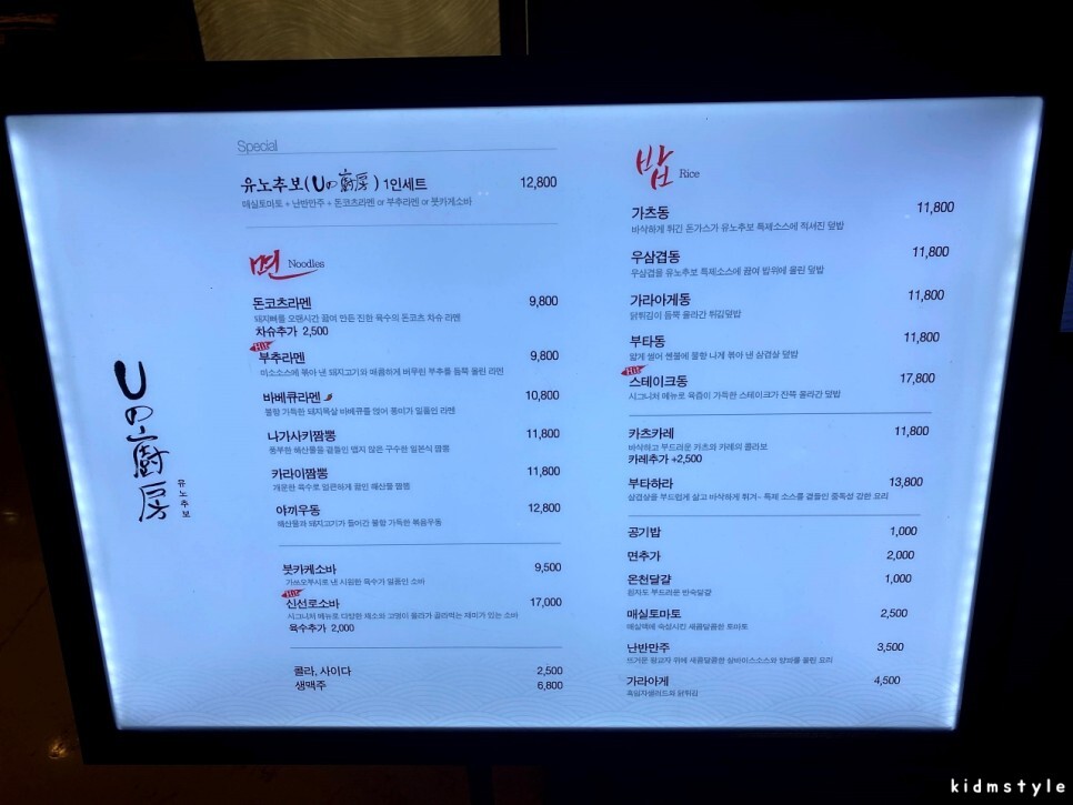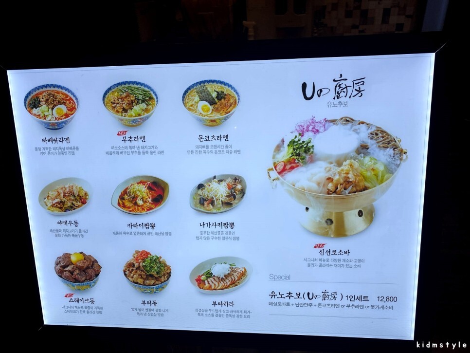 백화점 식당가라 가격은 조금 비싼 편이다. 유노추보 1인 세트 하나와 라멘 하나를 주문하기로 했다.