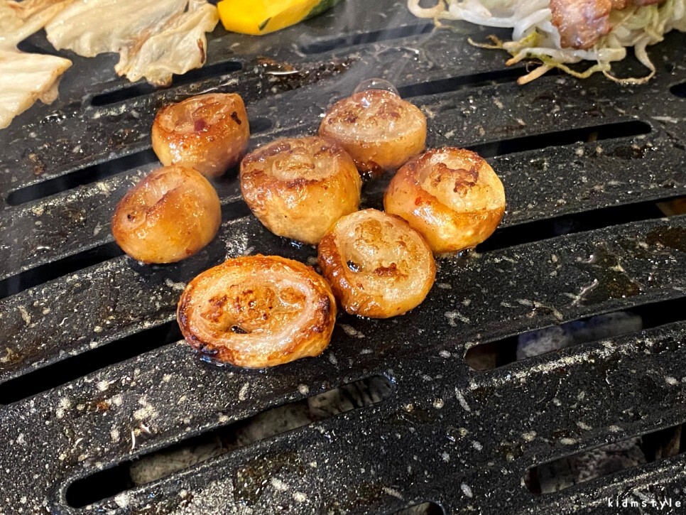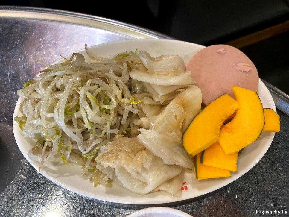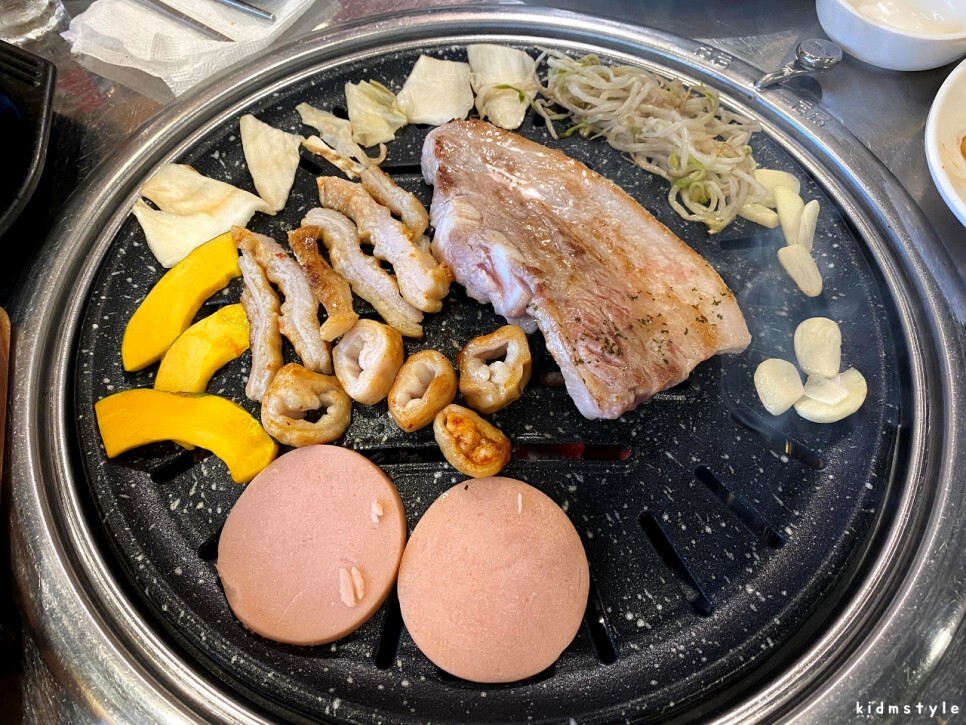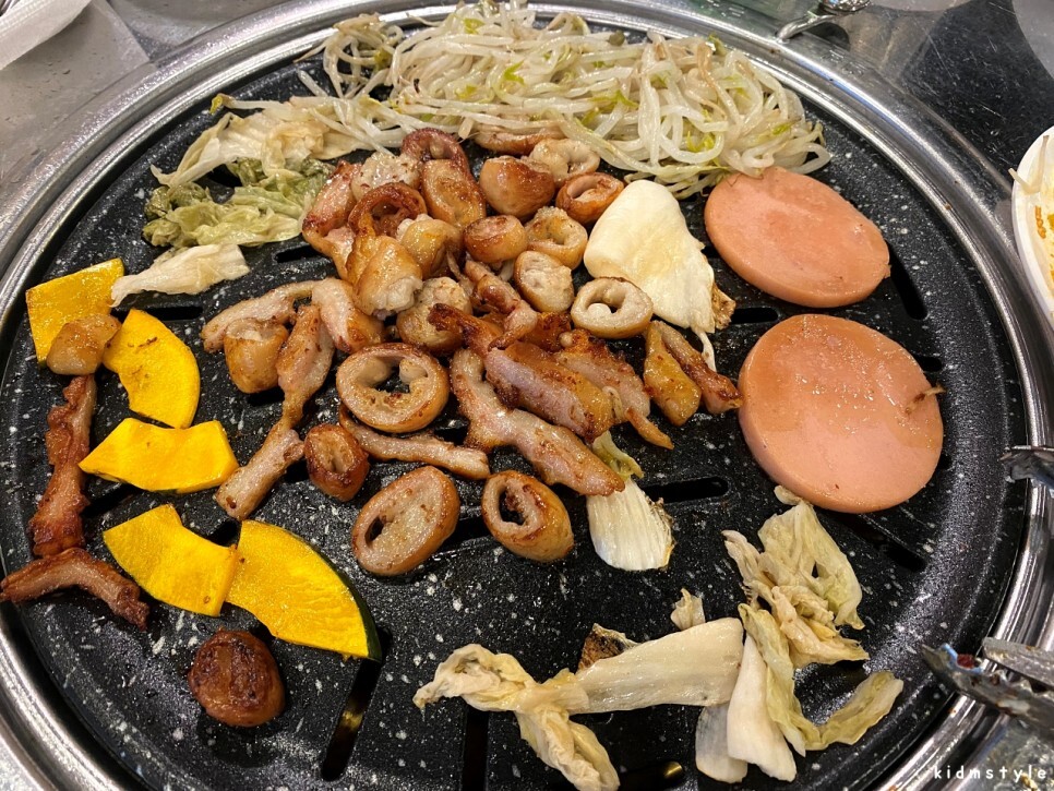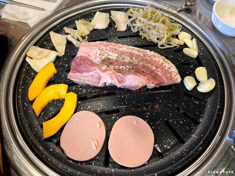 숙주, 백김치, 단호박, 옛날 소시지 등이 기본으로 제공된다. 구워 먹으면 참 맛있는 재료들이다.
