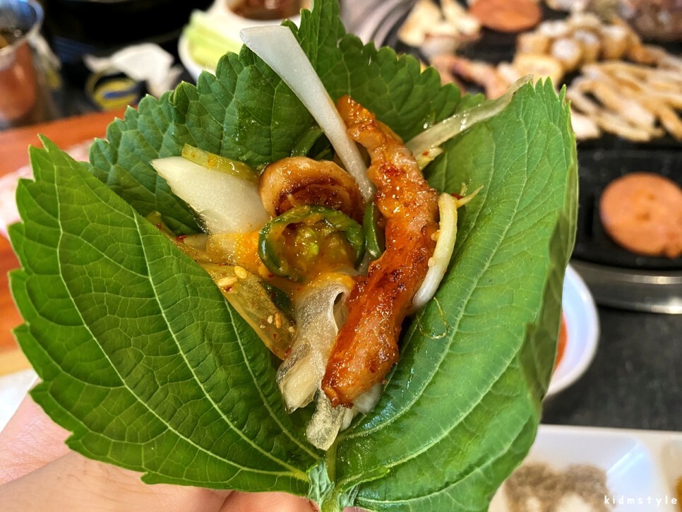 깻잎쌈을 싸서 막창을 먹어본다. 고소한 게 맛있다.
