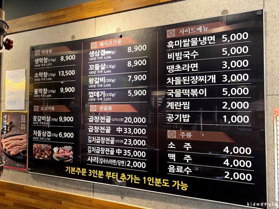 메뉴판이다. 생막창 2인분, 생삼겹 2인분, 소주 한 병을 주문한다.