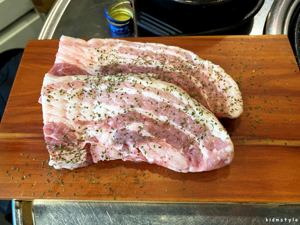 생삼겹살이 먼저 나왔다. 고기가 괜찮아 보인다.