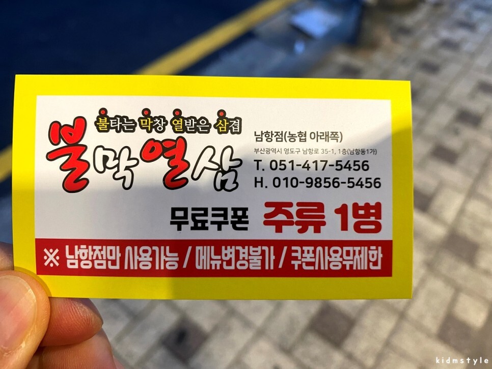 오래간만에 맛본 막창은 아주 성공적이다. 막창이 생각나면 불막열삼 남항점으로 가기로 했다. 가까워서 다 먹고 남포동까지 슬 걸어 나와서 2차로 맥주 한잔해도 되니 소화도 시키고 괜찮을 듯하다. 아주 맛있게 잘 먹었다. 불막열삼이라는 체인이지만 몇 군데 가본 결과 남항점만한 곳이 없는 것 같다. 음식의 맛도 좋고 재료도 신선하고 무엇보다도 친절하고 세세한 부분까지 신경 쓰는 사장님 및 직원분들이 인상적이었다. 이 집 추천한다.