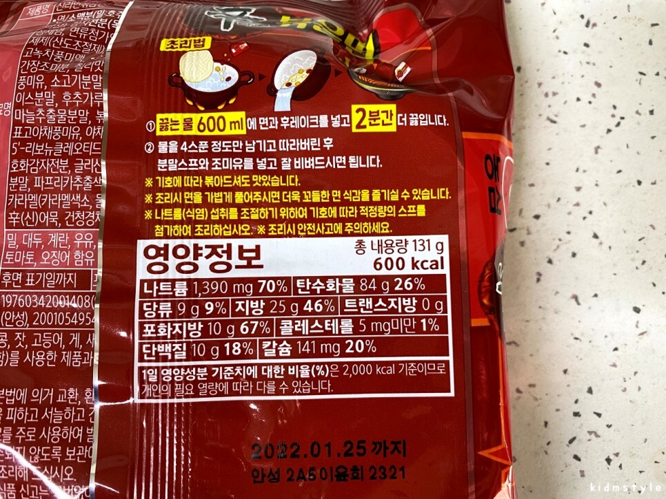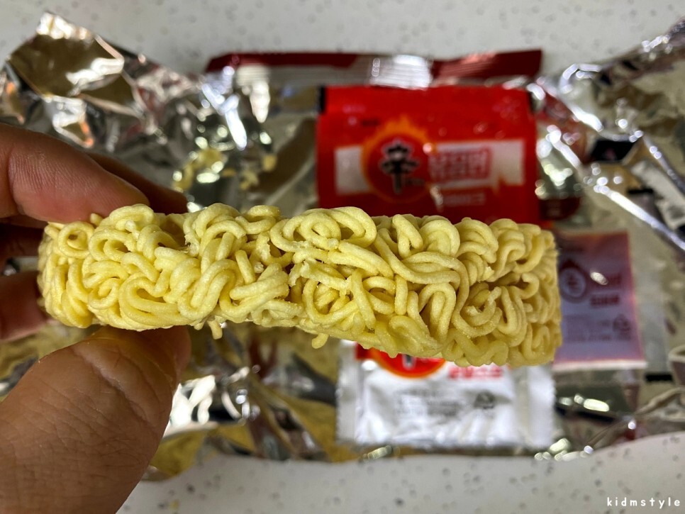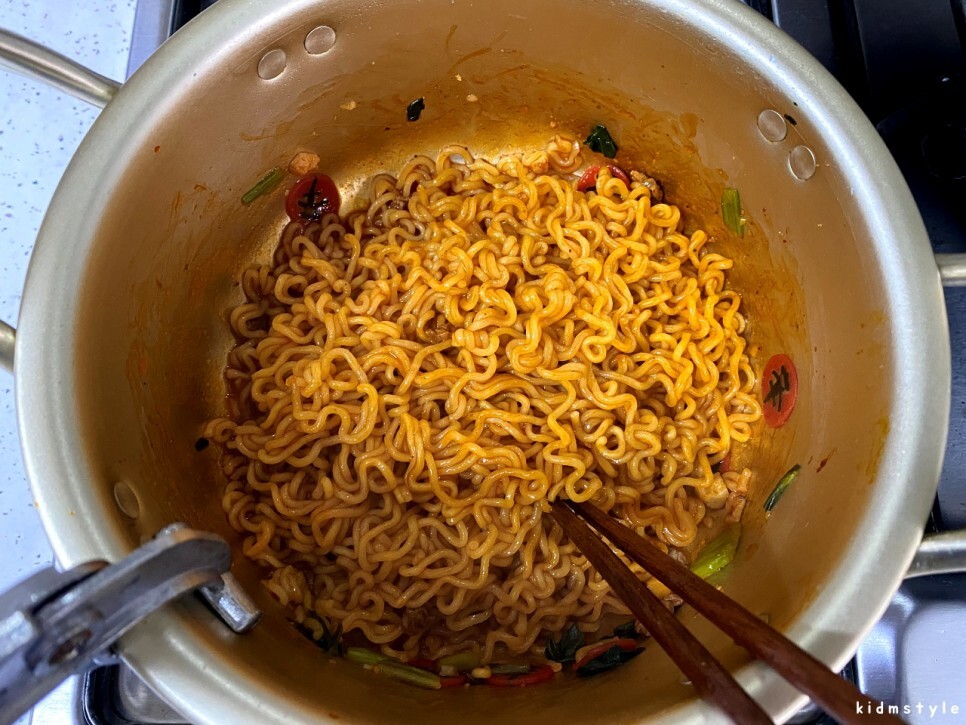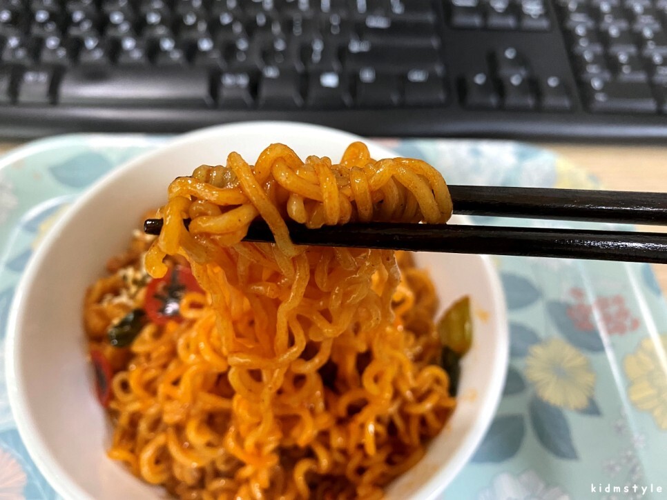 한 젓가락 집어서 맛보았다. 먹자마자 어릴 때 라면을 끓이면서 물을 다 버리고 자작하게 볶아먹던 쫄라면 맛이 생각난다. 스프를 다 넣으니 좀 짜다. 내 입맛에 짜다면 싱겁게 먹는 사람들은 한 젓가락 먹고 바로 젓가락 놓을 것 같다. 매콤한 맛도 나는데 신라면 정도의 맵기인데 국물이 없어서 조금 더 매운 느낌이다. 처음에는 매운맛이 별로 없다고 느꼈는데 먹다 보니 맵고 짠맛이 극대화된다.