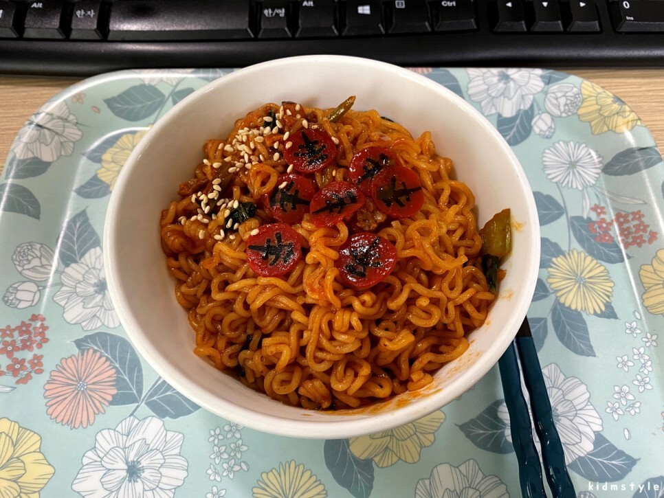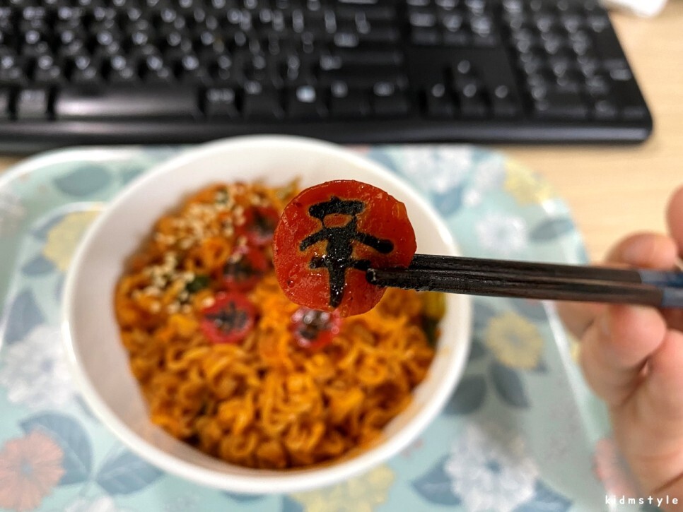 매울 신 辛의 신라면 모양의 후레이크가 아주 인상적이다. 매울 신 후레이크는 다른 비빔면 등과 구분 짓기 위해서 넣은 것 같다.
