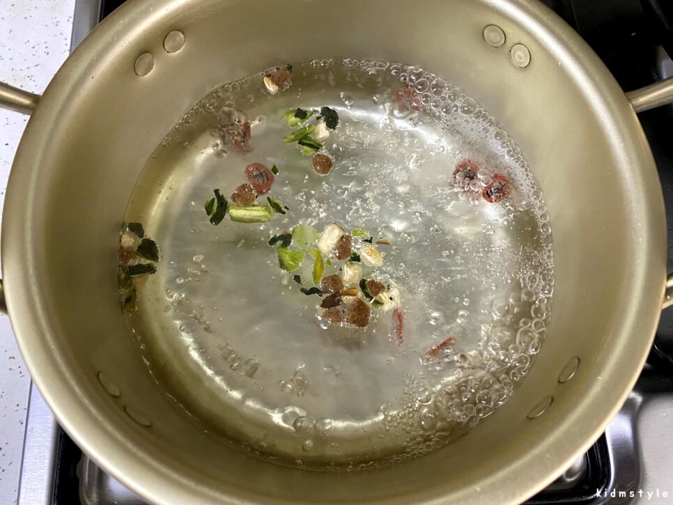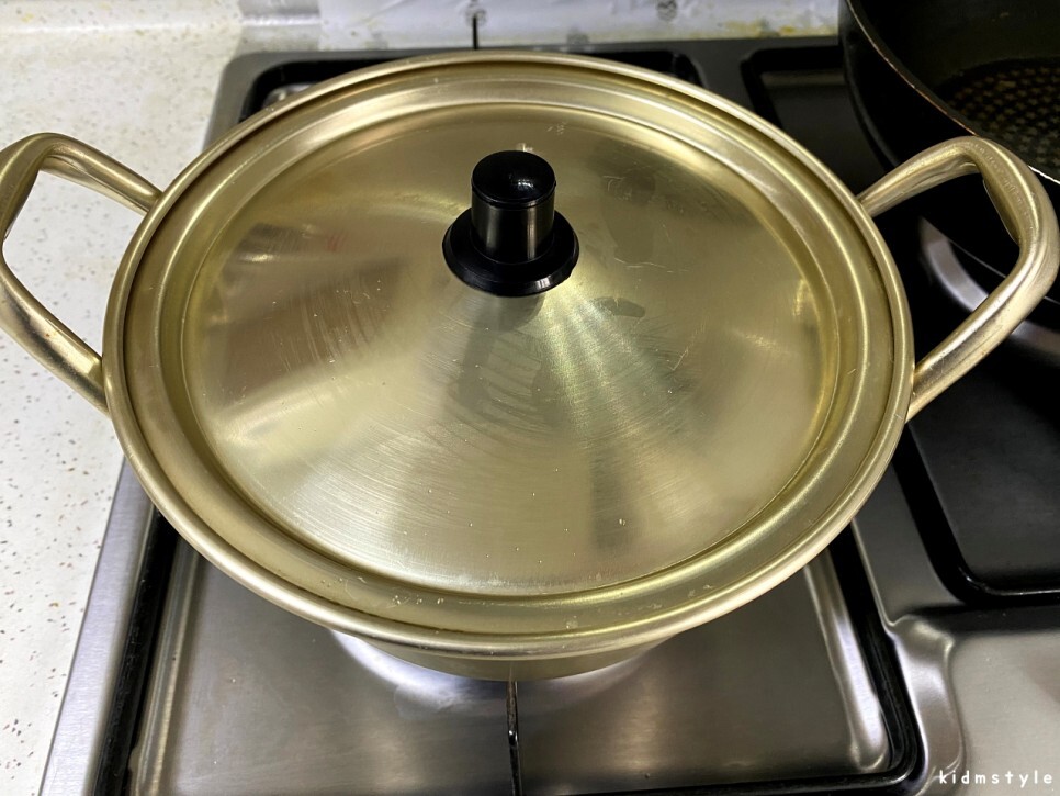 오래간만에 양은 냄비에 끓여본다. 물 600ml를 끓인다.