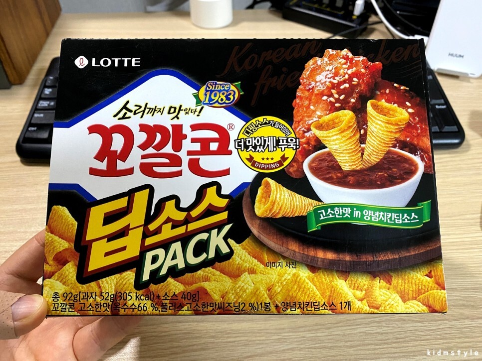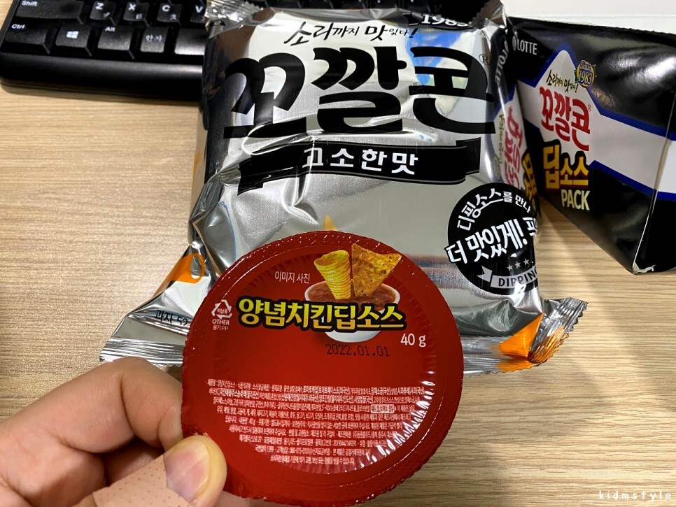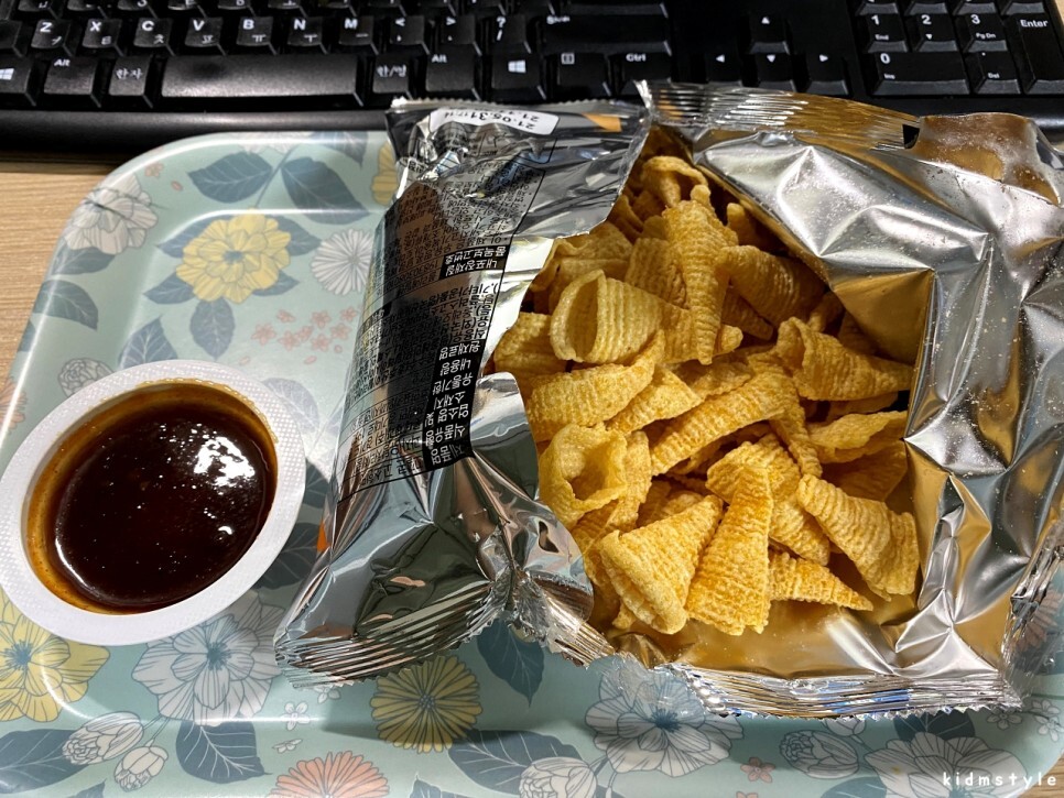 꼬깔콘 고소한 맛, 소스는 양념치킨 딥소스가 들어가 있는 모양이다.