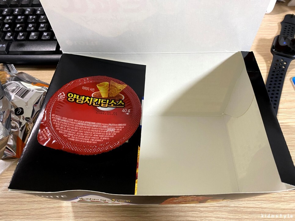 포장 상자에 이런 식으로 소스를 올려놓고 오른쪽에 과자를 부어서 먹으면 된다.
