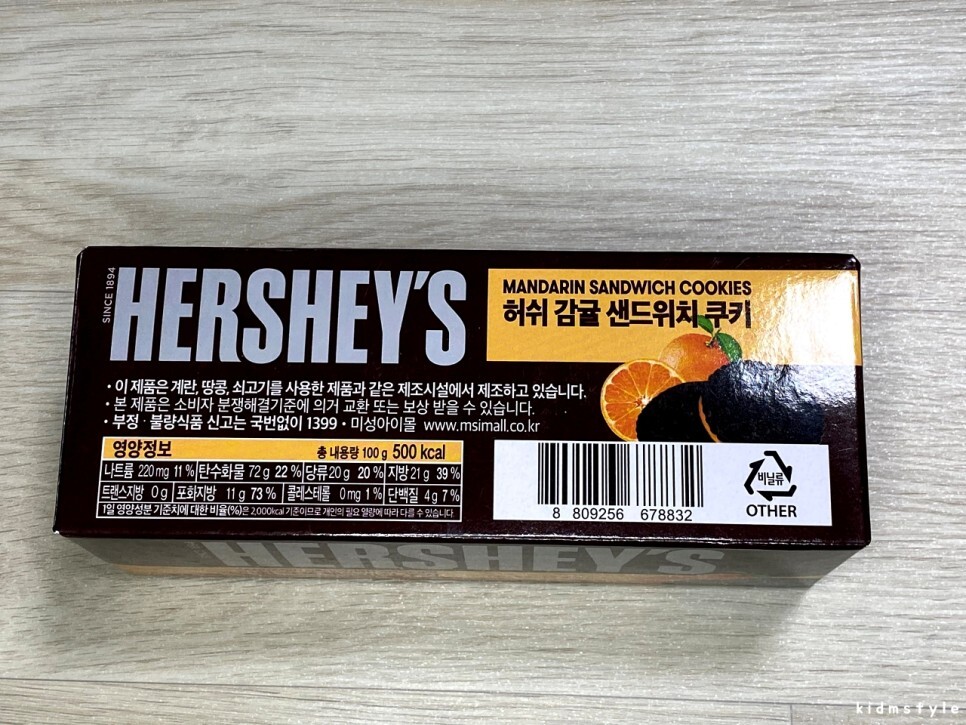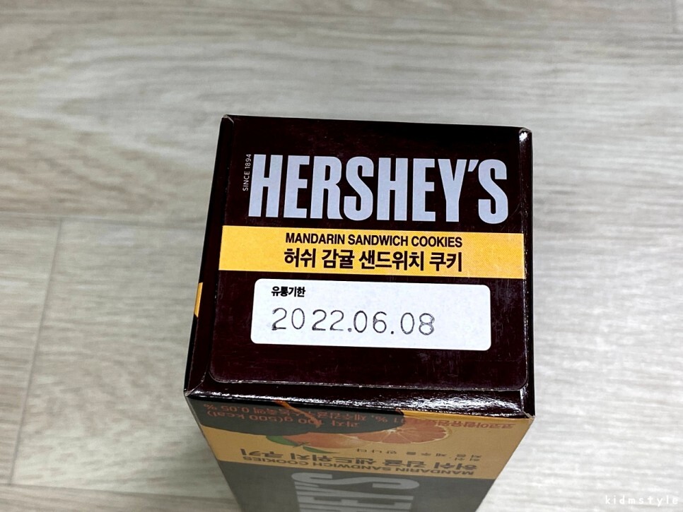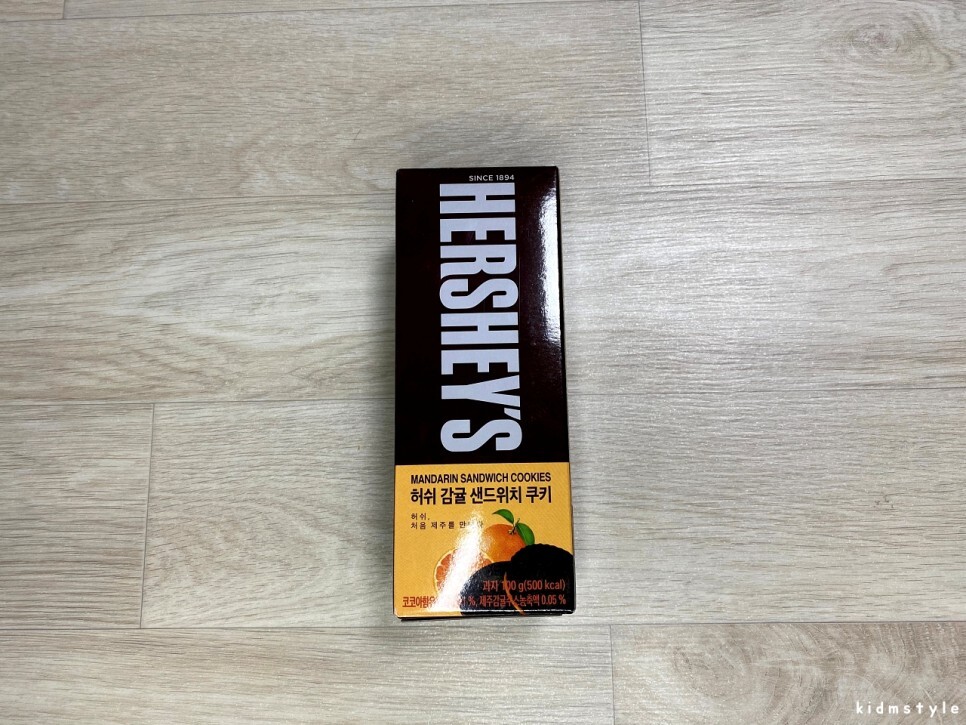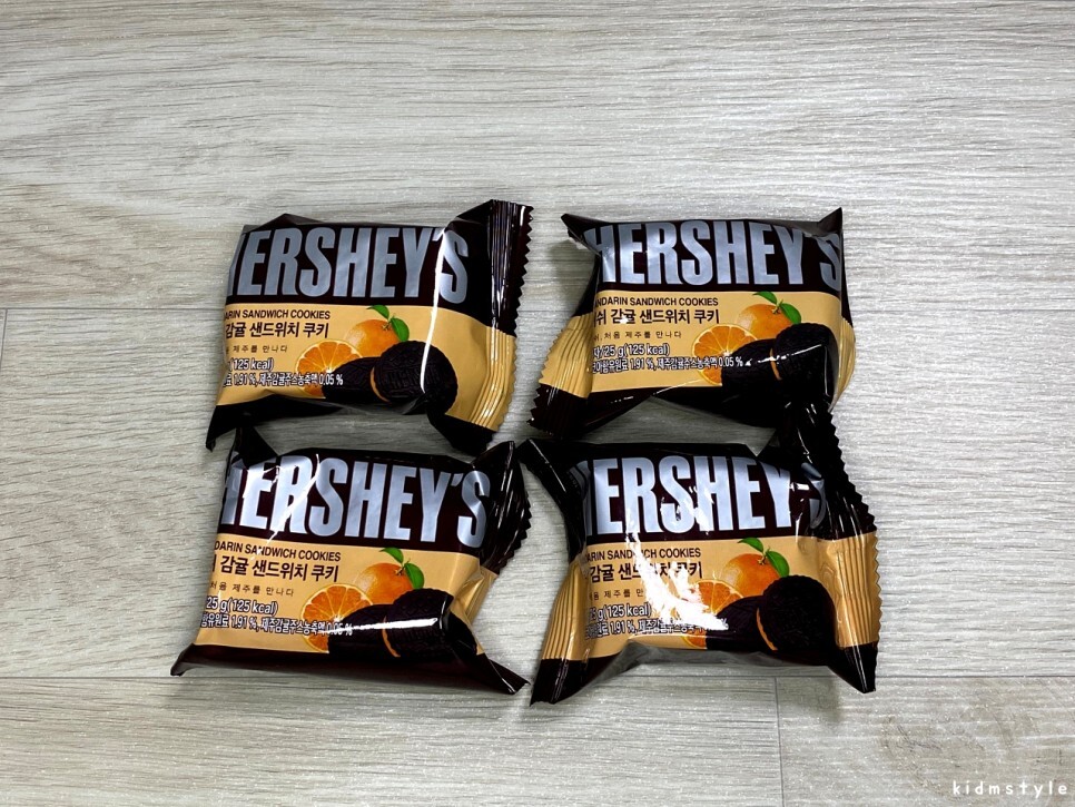 제주도에 다녀온 지인에게 선물을 받았다. 그중에 한 가지 아이템을 소개해본다. 허쉬 감귤 샌드위치 쿠키라는 제품이다.