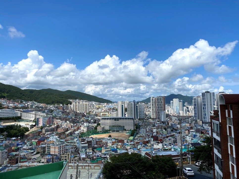 이바구공작소 옥상에서 바라본 동구의 모습이다. 명문 부산고등학교가 정면에 보이고 그 뒤로 최근 신축 완공된 아파트 단지들도 보인다. 산복도로의 다양한 주택들과 신축 아파트들이 조화롭게 이루어져 일상을 보여주는 풍경이다. 결국 우리가 바라보는 이 풍경은 우리의 일상이 되는 풍경이다.