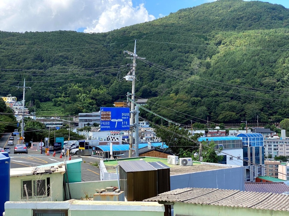 이정표 바로 아래에 길쭉한 건물은 최근에 완공된 초량2동 제2공영주차장과 망양로 산복도로전시관이다. 그리고 저 멀리 왼쪽 끝 노란색 건물은 이바구캠프, 그리고 그 옆으로 초량1941, 초량845 등 인기 많은 카페가 보인다. 오른쪽 끝으로 보이는 친환경 스카이웨이 전망대까지 근처에 가볼 곳이 참 많다.