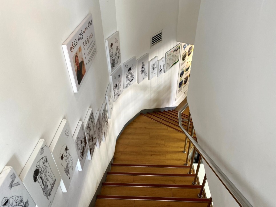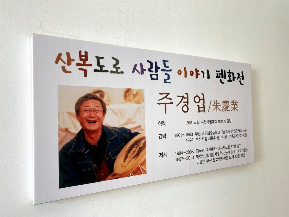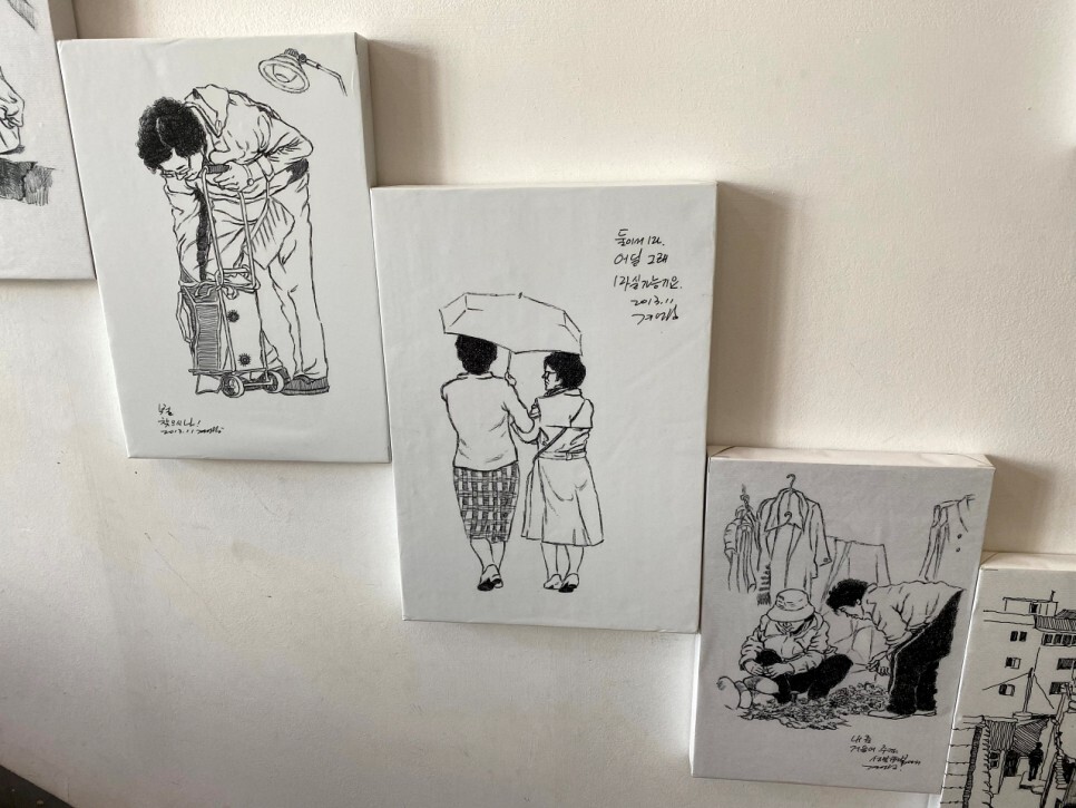 주경업님의 산복도로 사람들 이야기 펜화전이 전시되어 있다. 미술교사 출신으로 부산의 전통문화와 유적지를 답사하고 연구하는 모임인 부산민학회의 회장이다.