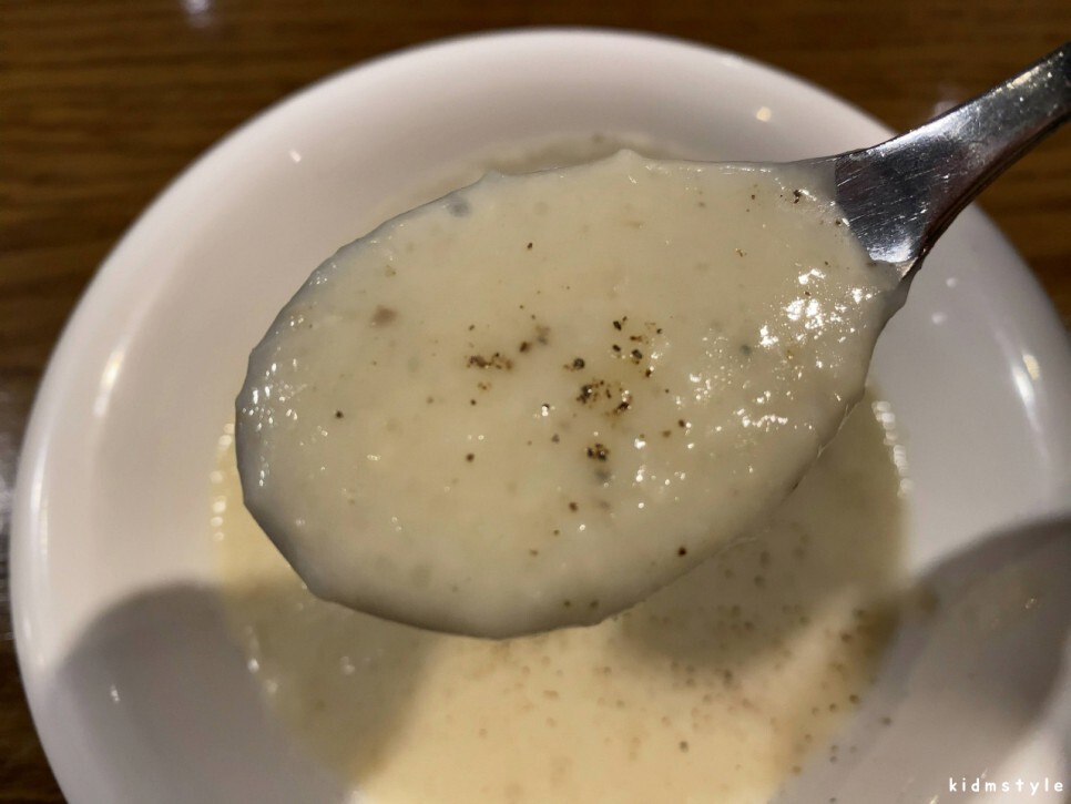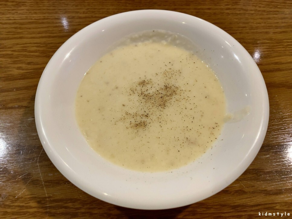 스프는 직접 만든 스프이다. 후추를 뿌려서 맛본다. 단맛이 많이 느껴진다. 호불호가 좀 갈릴 것 같다.