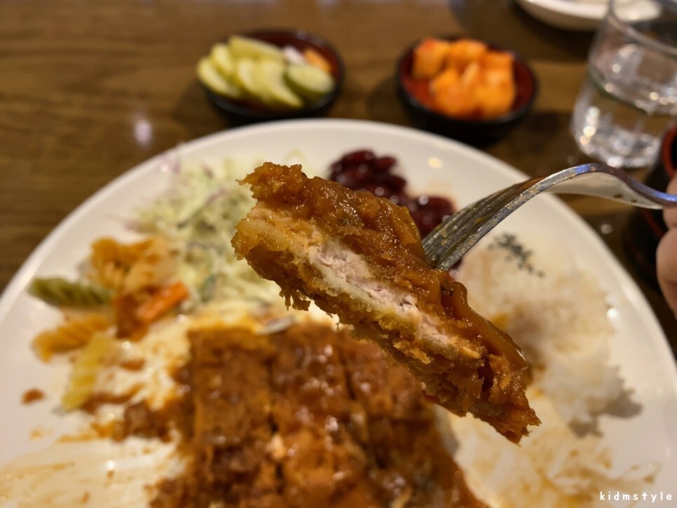 고기는 잘 튀겨놨고 잡내는 적다. 단점이 하나 있다. 기름을 많이 머금고 있다. 느끼함이 많이 올라온다. 이 부분이 좀 아쉽다. 고기는 부드럽고 잘 씹힌다. 힘줄 제거 및 연육 작업을 잘한 돈까스이다.