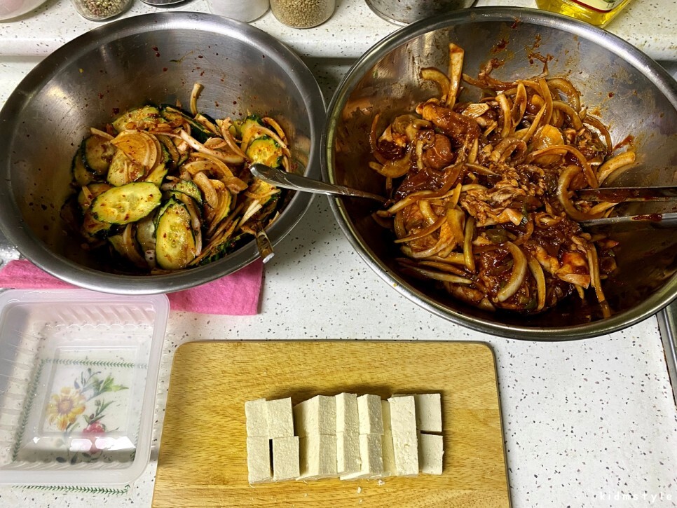 밀린 집안일을 후딱 끝내고 간단하게 요리 시작해보자. 어제 산 오이 하나로 오이무침 후딱 10분 컷, 돼지 뒷다리살 양념 후 재워두기 10분 컷, 동시에 된장찌개도 같이 진행한다. 된장찌개 역시 10분 컷이다. 솥뚜껑 운전하시는 분들은 공감하겠지만 솔직히 기본 축에도 못 드는 아주 난이도 하의 조리이다.