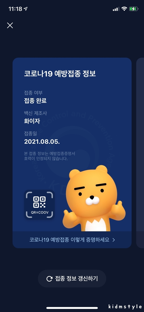 맞고 나서 카카오톡에 들어가 보니 코로나19 예방접종 정보가 떠있다. 그리고 coov 앱에도 들어가 보니 1차 화이자, 오늘 날짜로 떠있다. 참고로 1, 2차 접종 완료를 하면 카카오톡 라이언이 쌍따봉을 한다고 한다.