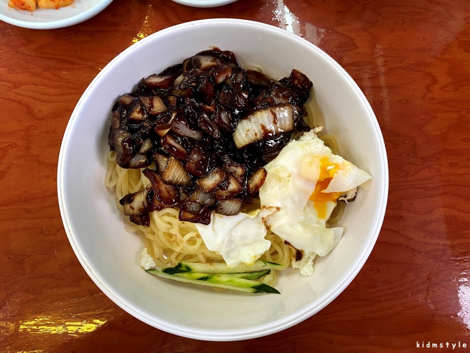 7,000원 짜리 간짜장 면이다. 계란 후라이와 오이 고명.