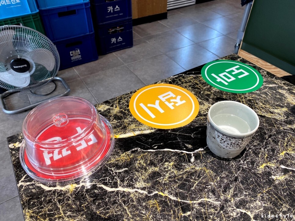 먹고 나서 뚜껑, 접시, 도마 자리에 각가 놔두면 직원분이 수시로 치워준다.