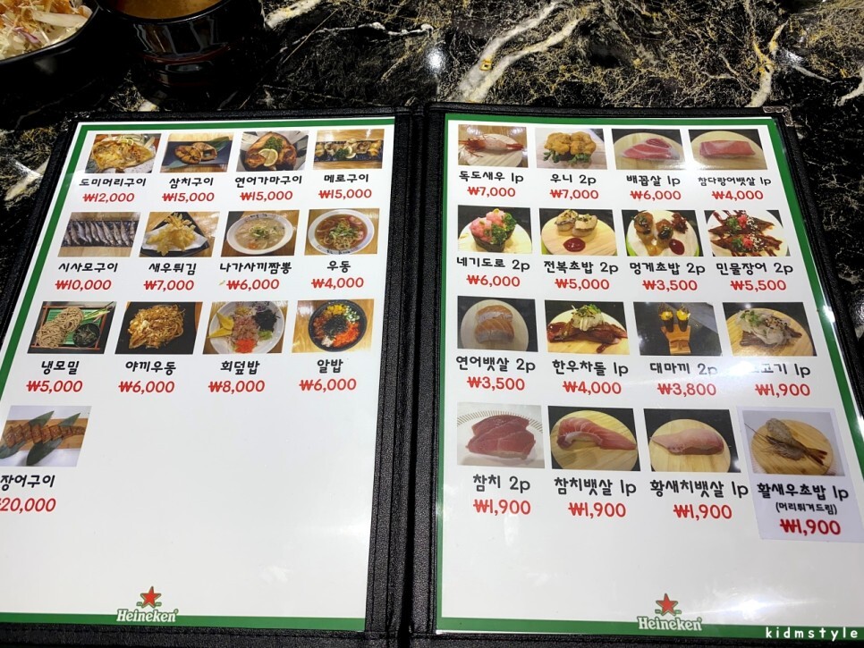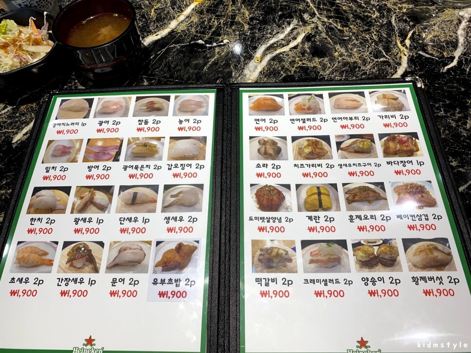 회전하는 레일 위의 모든 접시는 접시당 1,900원이다. 그 외에 다른 메뉴들도 있으니 메뉴판을 참고하기 바란다.