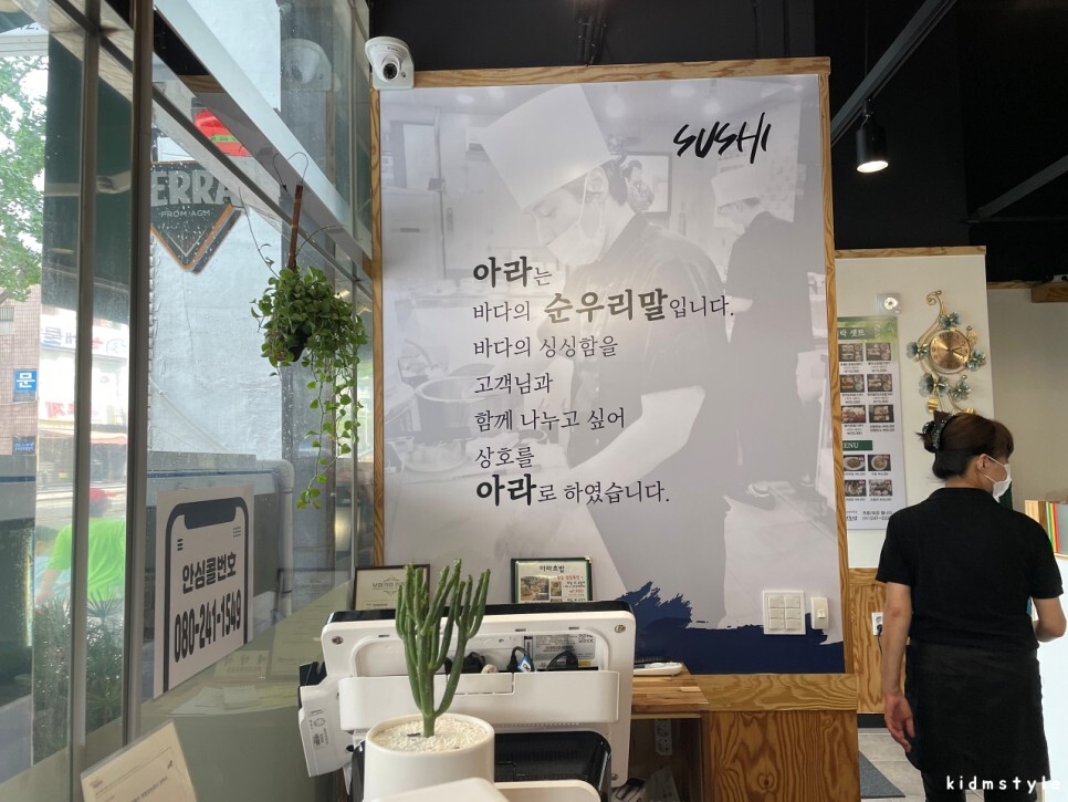 상호 아라회전초밥의 '아라'는 바다의 순우리말이라고 한다. 바다의 싱싱함을 고객과 함께 나누고 싶어서 아라로 하였단다. '아라' 이름이 이쁘다.