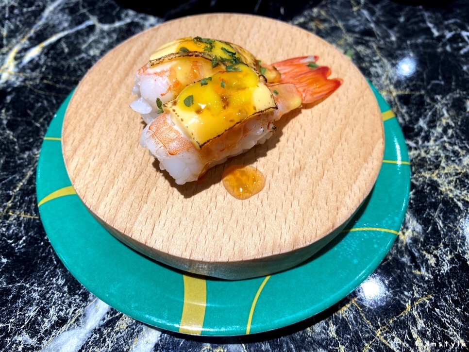 생새우치즈구이초밥이다. 소스와 치즈가 새우와 잘 어울린다.