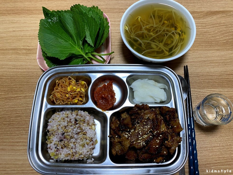 저녁을 간단하게 차려보았다. 베란다 텃밭에서 직접 재배한 무공해 깻잎 몇 장, 땡초 넣고 끓인 다음 냉장고에 넣어둬서 시원한 콩나물국, 콩나물무침, 쌈무, 냉동 소분해 둔 쌀, 잡곡 비율 = 1:1의 잡곡밥, 직접 양념을 하고 구운 돼지 불고기, 그리고 소주 한 잔이다.
