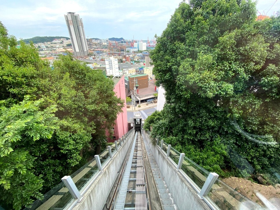 엘리베이터를 타고 올라가면서 바라본 모습이다. 수풀을 사이에 두고 보이는 부산의 풍경이 참 멋지다.