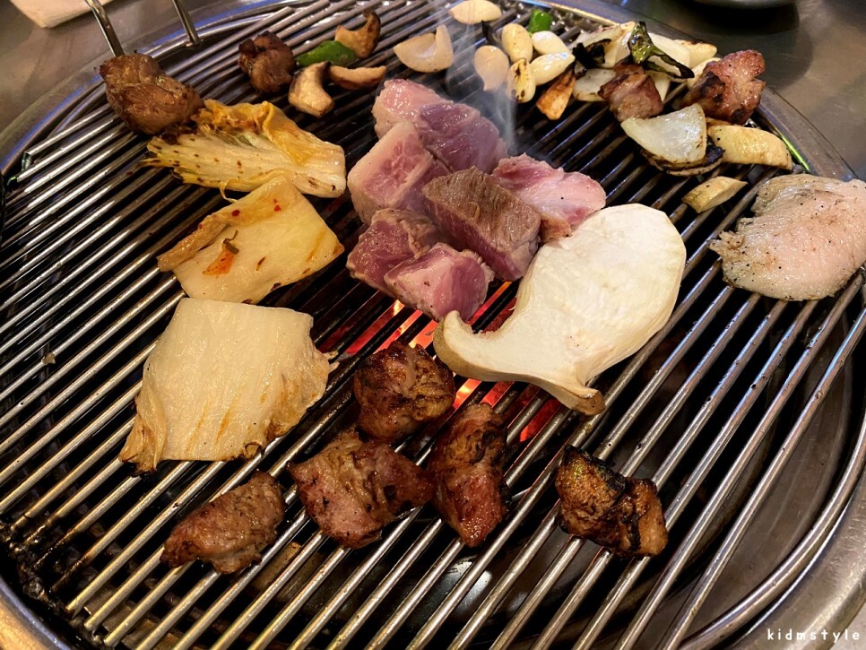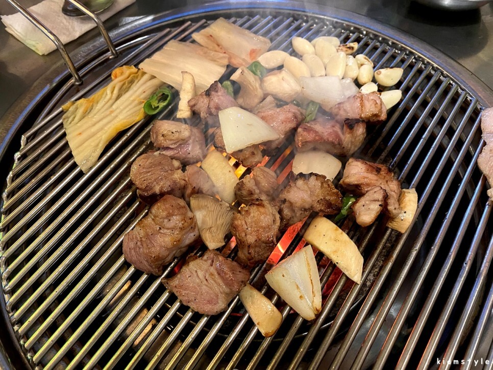 본격적으로 구워본다. 새송이버섯, 양파, 고추, 백김치 등을 같이 볶아준다. 고기 굽는 냄새가 후각을 자극한다. 이 순간이 가장 설레는 순간이다.