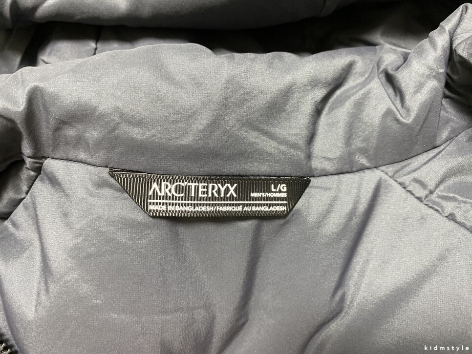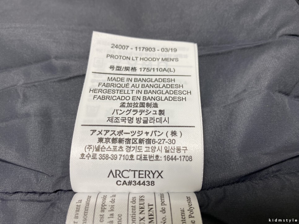 아크테릭스는 가품이 워낙 많다. 가품의 경우 옷 안쪽에 달려있는 이 택에 한글 표시만 봐도 바로 표가 난다.