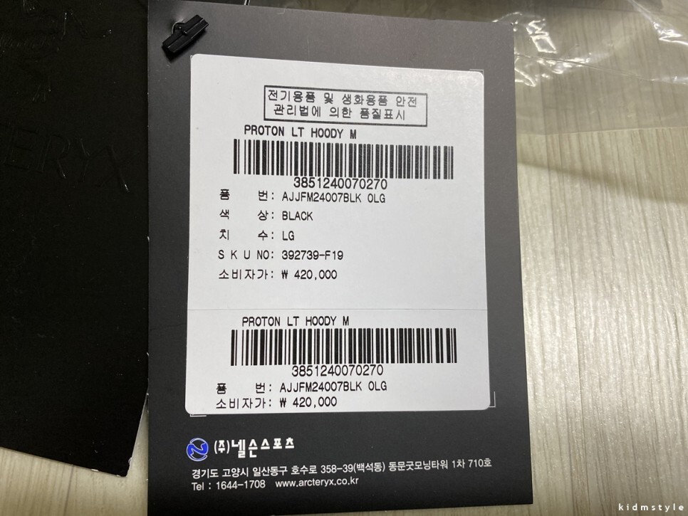 아크테릭스도 파타고니아 제품처럼 처음 생산할 때부터 한국용 택이 달려있다.