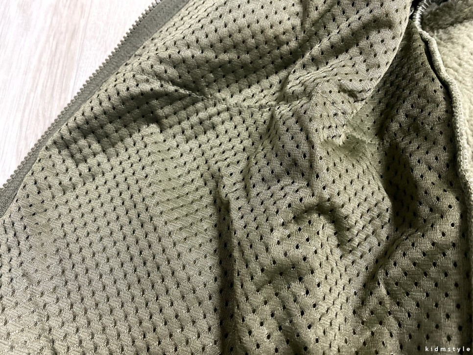 안쪽 모습이다. 전체가 이런 재질이 아니고 앞쪽만 이런 재질로 되어있다. 레트로X처럼 방풍필름으로 착각하는 경우가 있던데 아니다. 그냥 구멍 뚫려 있고 덧댄 수준의 천 재질이다. 방풍 기능 전혀 없다. 주머니 부분을 위해서 덧댄 부분이라고 생각하면 된다.