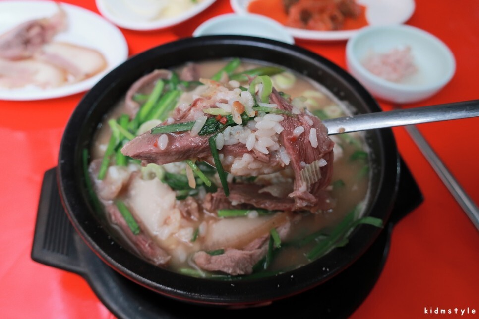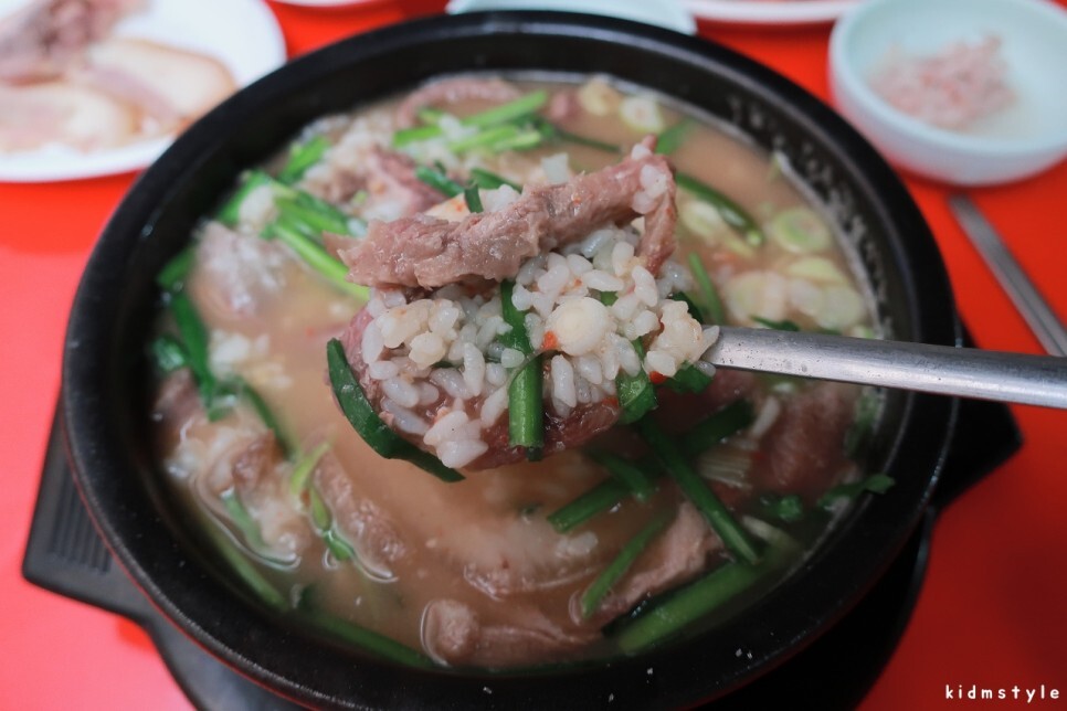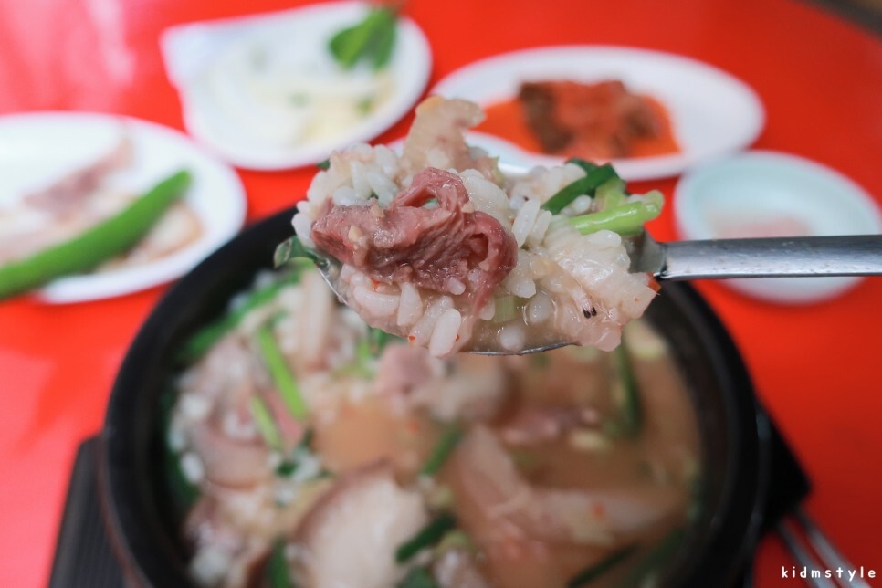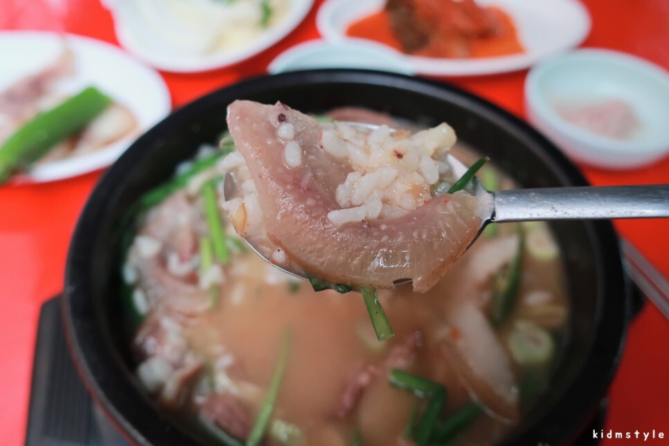 고기가 상당히 많이 들어가 있다. 열심히 맛보자. 머릿고기를 좋아한다면 이 집 아주 강력 추천이다. 볼살, 귀때기살, 턱살, 덜미살 등 다양한 머릿고기의 향연을 즐길 수가 있는 그런 국밥이다. 야성미가 마~ 제대로 느껴지는 이것이 바로 부산의 국밥이라고 자신 있게 말할 수 있는 그런 국밥이다.