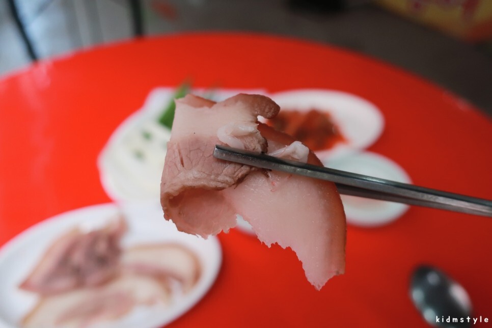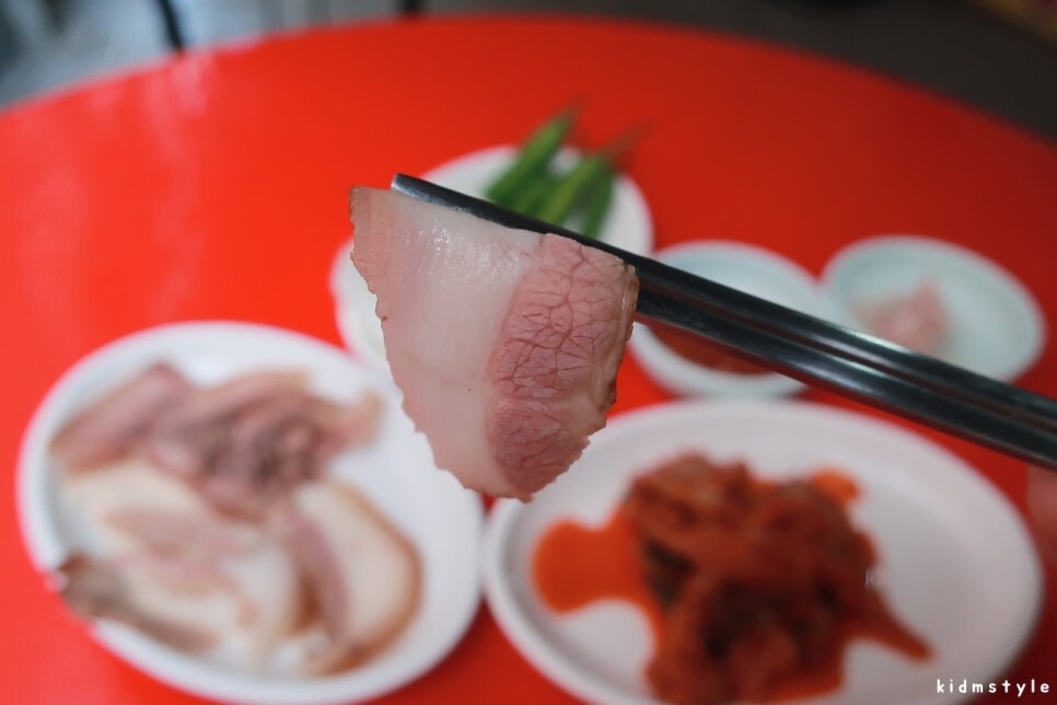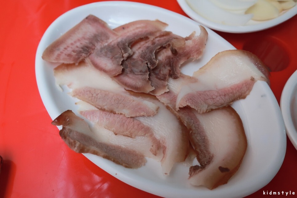 손질에 상당한 정성이 들어간 이런 머릿고기 수육을 맛보는 행운을 가지다니 먹기 전부터 아주 기분이 좋다. 식감은 부드럽고 쫄깃하고 입안에서 기분 좋게 돌아다닌다. 예상과 달리 잡내가 하나도 없다. 돼지머리 손질을 하면서 잡내를 잡는 것이 키포인트라고 그 부분에 대한 정성이 많이 들어간다는 사장님의 이야기가 매치가 되는 순간이다. 잡내가 없고 오히려 구수하다. 소주 한 병 주문할까 심각하게 고민했다. 다음 스케줄만 아니었다면 소주 한잔했을 것 같다.