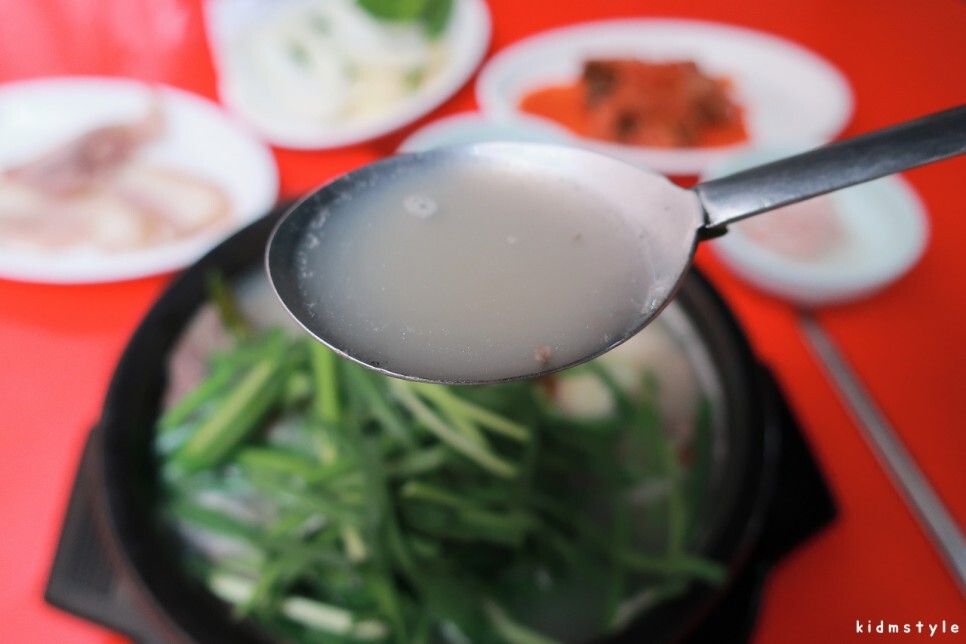 국물은 상당히 맑다. 맛을 보니 상당히 깔끔하다. 사골 육수로 낸 깔끔하면서 담백한 육수이다. 머릿고기가 들어가는 돼지국밥이라 머릿고기 육수라고 생각할 수도 있으니 직접 물어보니 사골 육수 국물이라고 귀띔해 주신다. 예전에 포스팅한 적이 있는 보수동의 김광자돼지국밥의 국물과 비슷하다. 상당히 깔끔하다.