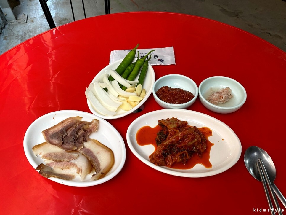 아직은 더운 한여름의 끝자락 8월 말이라 에어컨이 없는 실내에서 식사는 어려울 듯 싶어서 야외 테이블에 자리를 잡았다. 건물 골바람이 불어서 그런지 바람이 시원하다. 친한 단골손님의 소개를 받고 온 손님이라고 기어이 수육 한 접시를 서비스로 내주신다. 기분이 좋구먼.