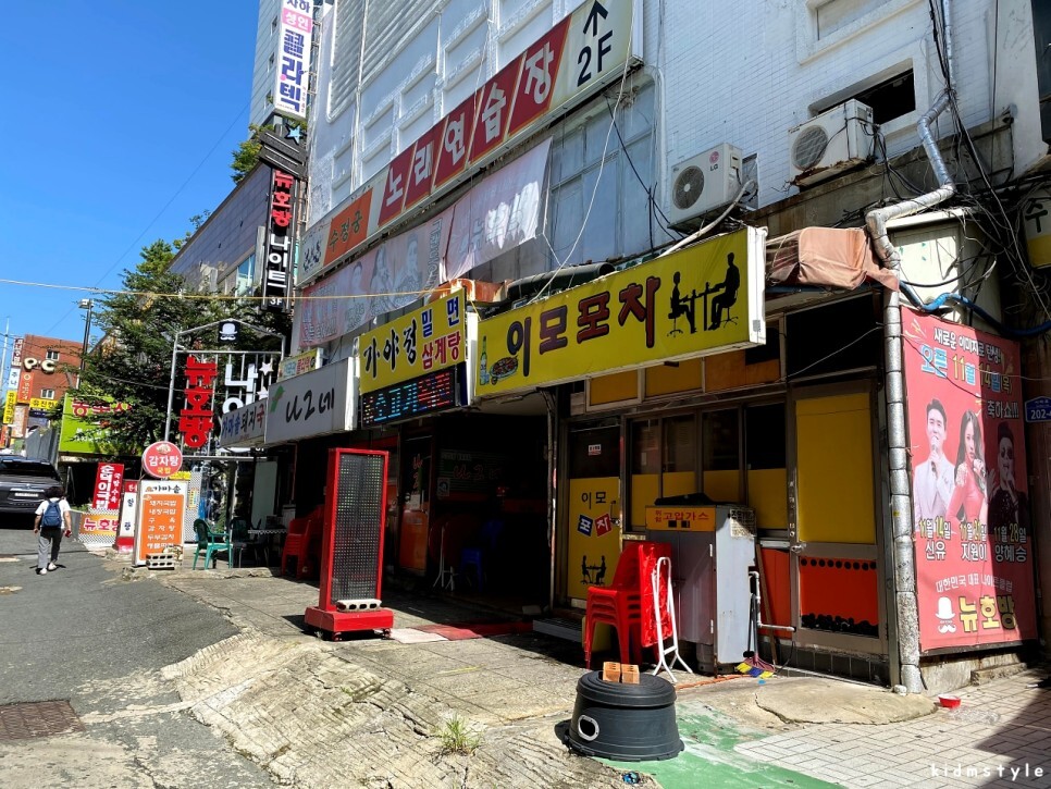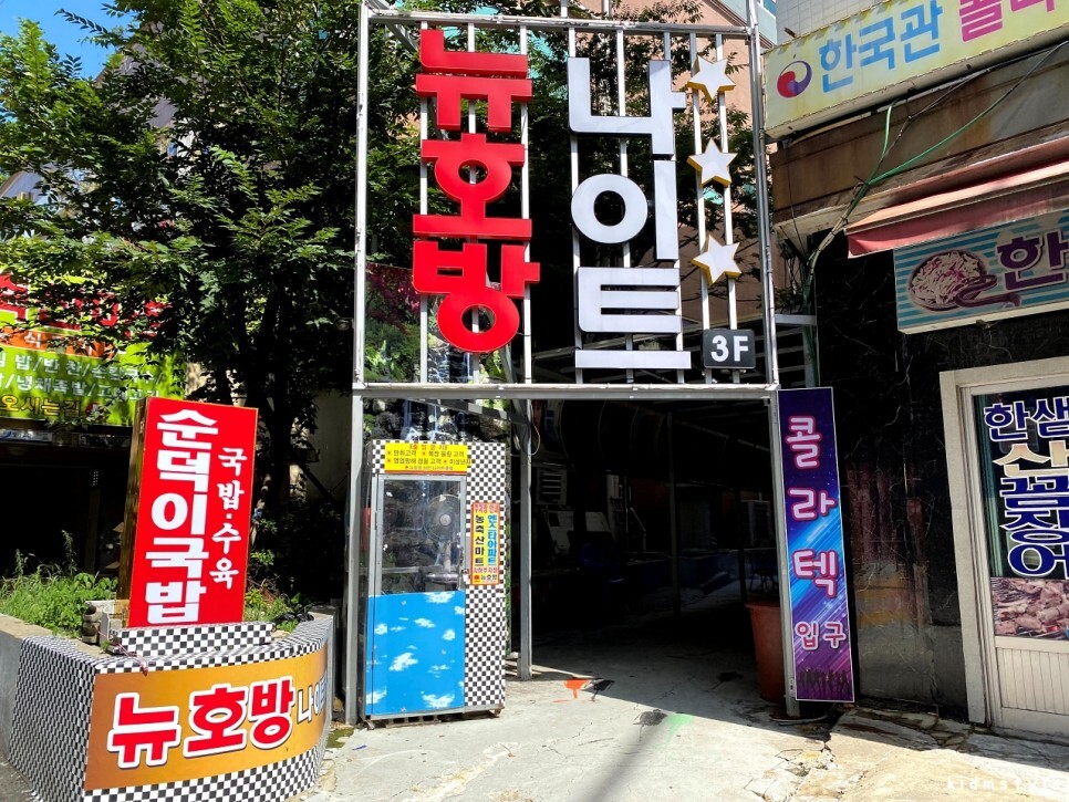 골목으로 내려오면 뉴호방나이트 건물이 눈에 들어오고 1층에 식당이 몇 군데 보인다. 한창 나이트가 인기 있던 시절, 길 건너 메리트 나이트클럽이 2~30대를 위한 곳이었다면 뉴호방은 4~50대에게 인기가 많던 곳이었다. 메리트 자리는 아파트가 생겼고 뉴호방은 명맥만 유지하고 있는 모습이다. 그 당시 새벽 시간에 부근에 포장마차에 자리가 없을 정도로 복잡했던 기억이 난다.