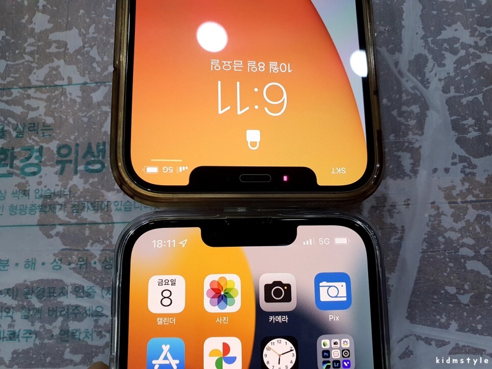 전면 비교 사진이다. 아이폰 13프로에 대한 단점을 꼭 이야기하고 싶은 게 하나 있다. 바로 무게이다.