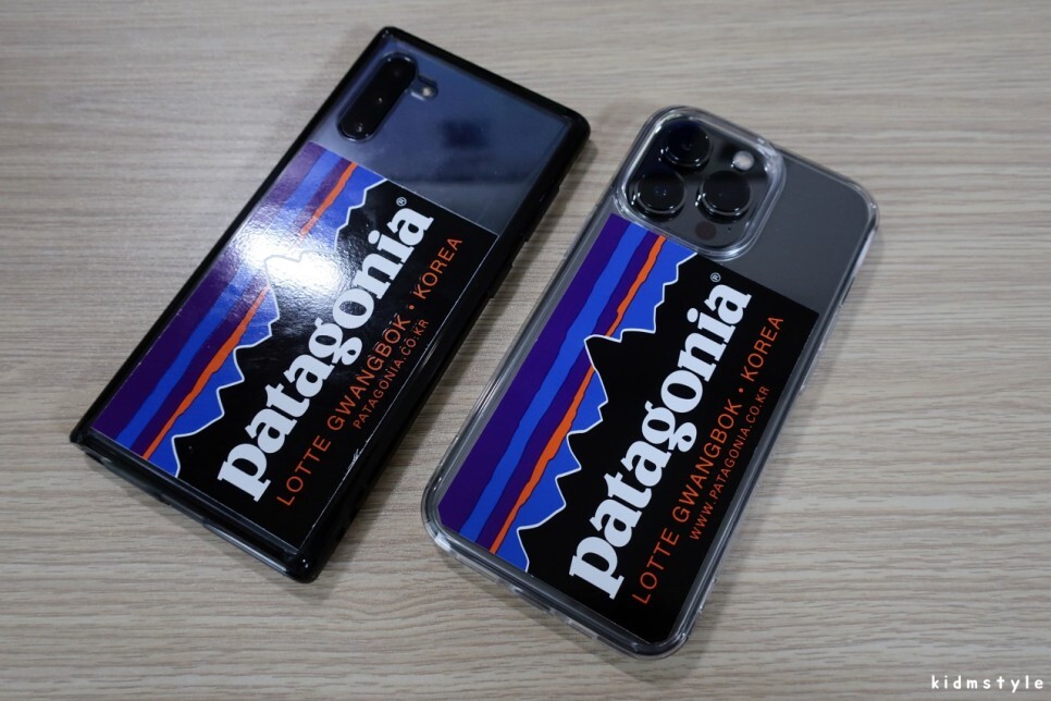 미리 준비한 링케 퓨전 케이스를 씌우고 강화유리를 붙였다. 케이스 뒷면이 밋밋해서 파타고니아 스티커를 붙여보았다.