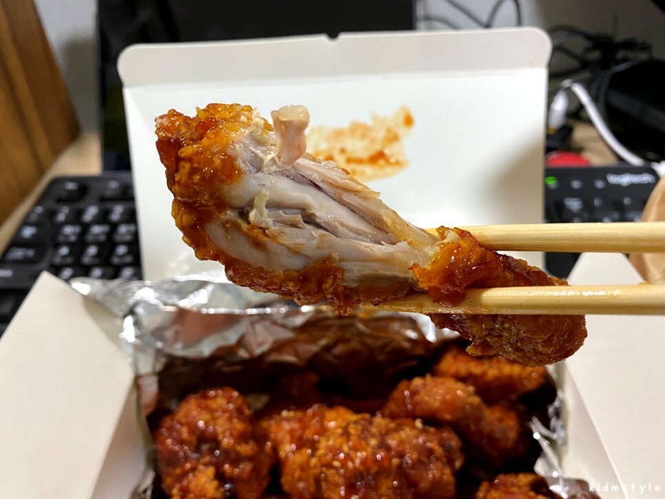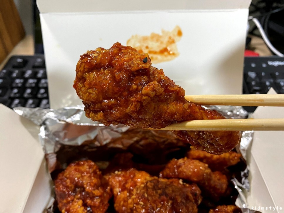 양념치킨은 닭다리를 먼저 맛본다. 역시 맛이 괜찮다. 후라이드나 양념이나 상당히 깔끔하면서 고소하고 바삭하고 균형이 잘 잡힌 맛있는 치킨이다.