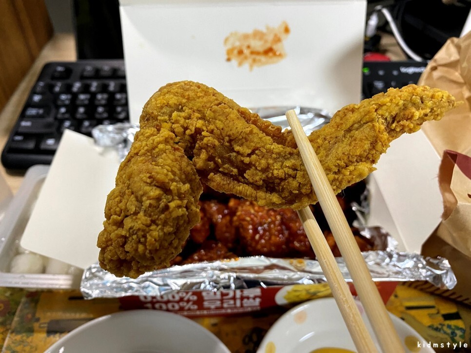 후라이드 날개부터 집어서 맛본다. 쌀통닭 매장이 거의 없어서 맛보기 힘들지만 한번 맛본 사람은 마니아가 된다. 꽤 맛있다. 바삭하면서 간도 잘 되어있고 기름기도 잘 잡아놨고 아무튼 맛있는 깔끔한 후라이드 치킨이다.