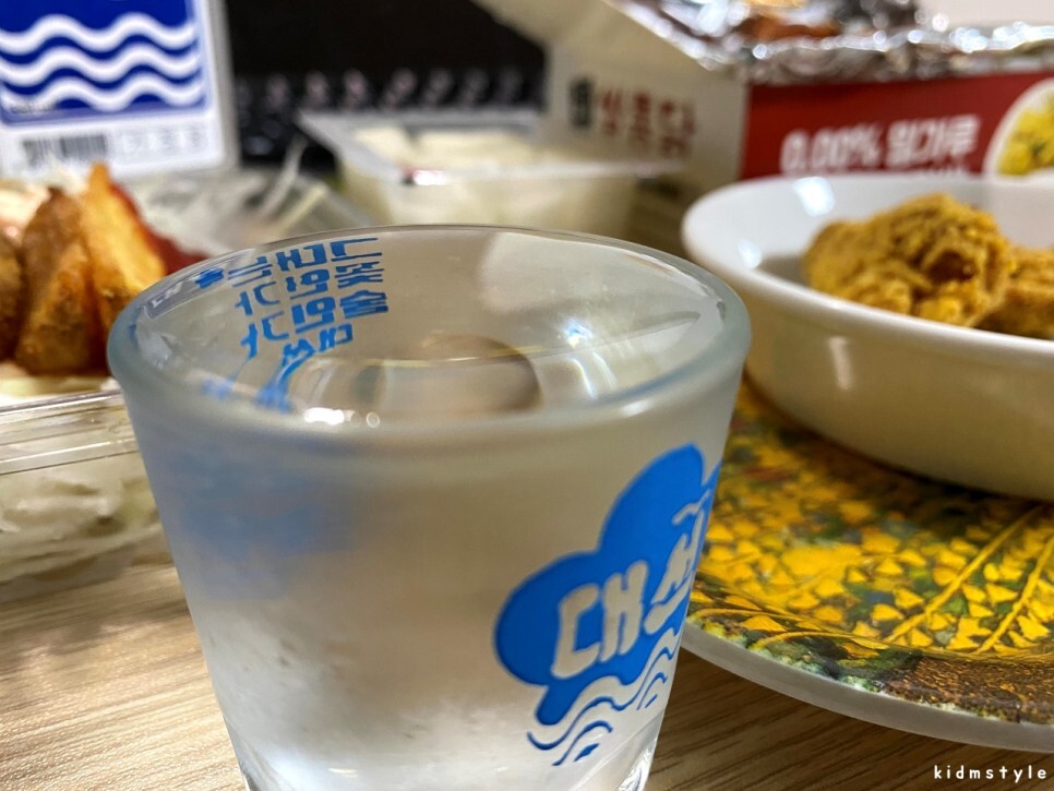치소~ 치맥 다 좋지만 역시 치킨에는 소주이다. 사실 맥주랑 먹어도 맛있는데 혼자 먹을 때는 맥주랑 먹으면 배불러서 치킨을 많이 못 먹기 때문에 소주랑 먹는 편이다. 소주잔에 가득 소주를 따라본다.